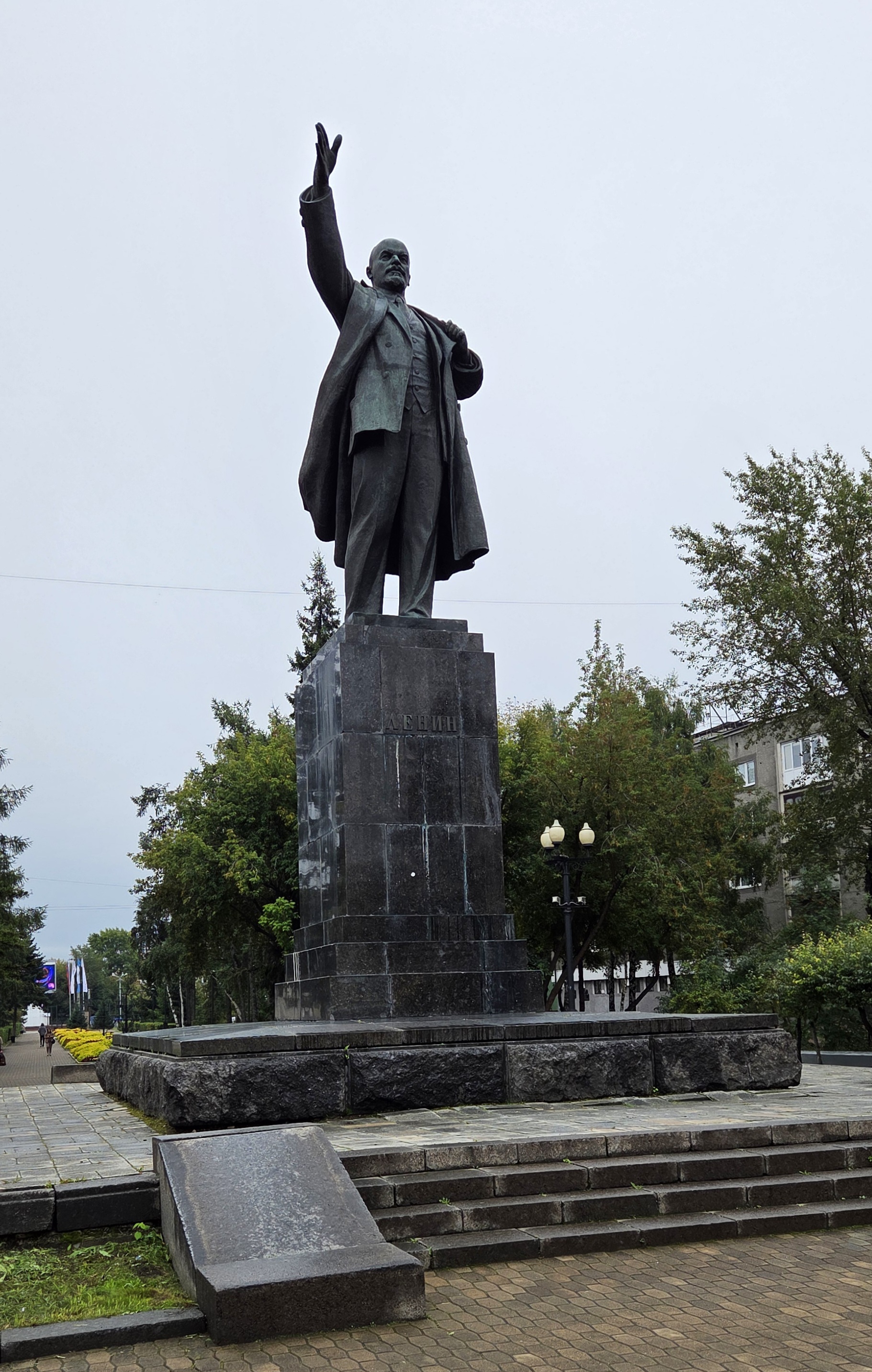 Lenin in Irkutsk faces northwest, his expression a bit less stern than in some depictions. He beckons, chest thrust proudly forward. He wears his coat here, rather than draping it as a cloak. The coat is open as he also appears to be. This is a fluid Lenin.
